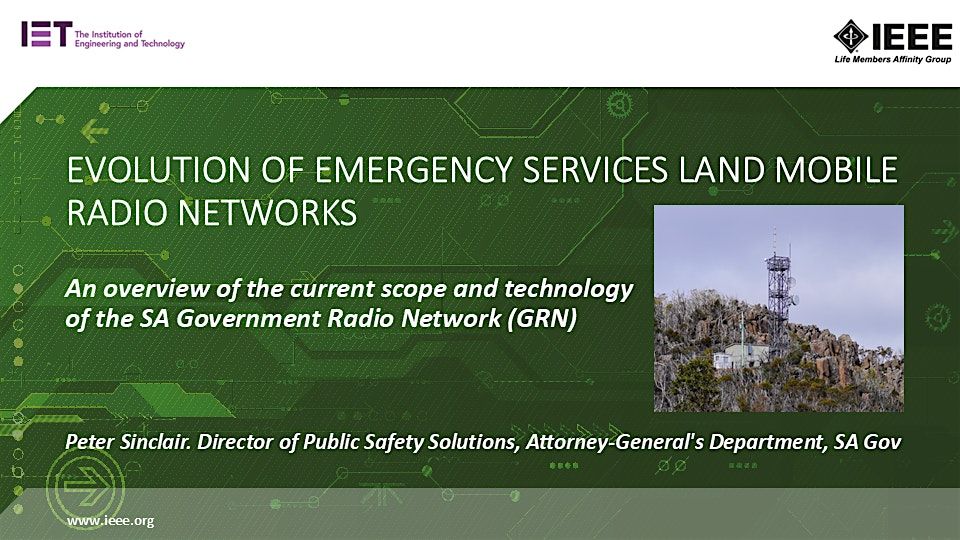 The presentation will provide an overview of the current scope and technology of the SA Government Radio Network (GRN) including mobile radio, paging, voice recording and mobile data. Peter will describe the current technology and how the Emergency Services Radio networks differ from mobile phones in functionality, reliability and coverage. The evolutionary changes for the next system update; and efforts towards a compatible national network will de described.