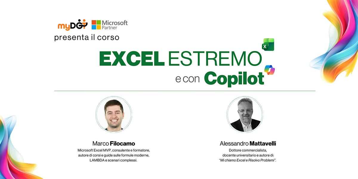 Un'esperienza intensa e formativa con Marco Filocamo e Alessandro Mattavelli per padroneggiare Excel come dei veri maestri e comprendere anche a pieno le potenzialità di Microsoft Copilot (a tutti i partecipanti che completeranno il corso oltre all'attestato ci sarà un buono sconto per la sottoscrizione annuale di Microsoft Copilot)