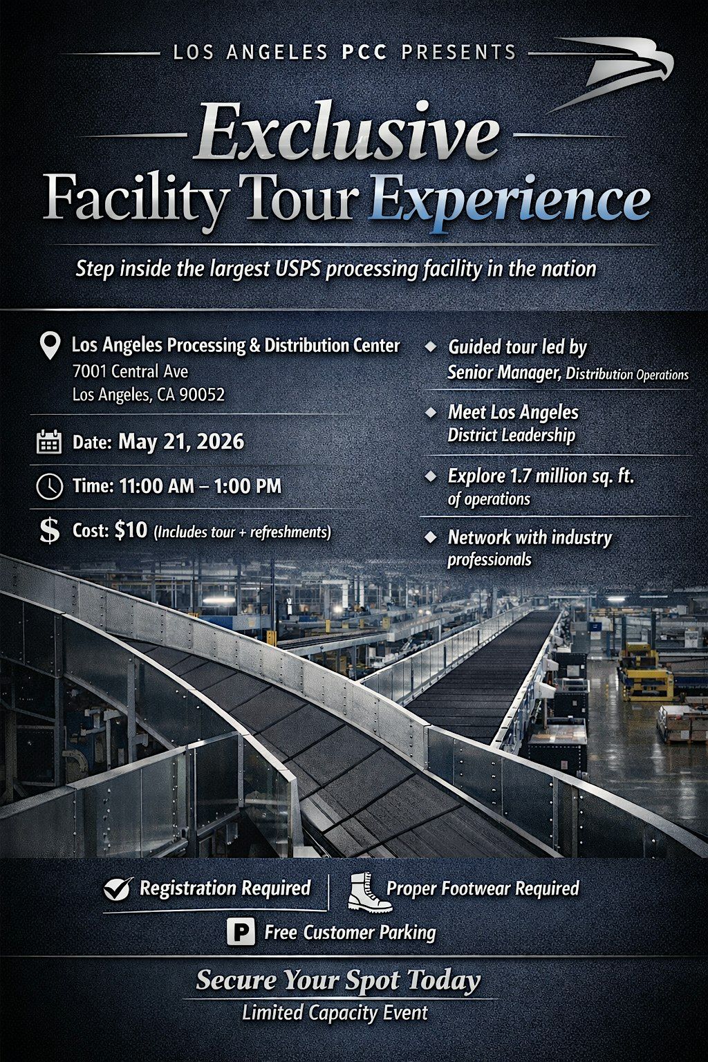 Step inside the largest USPS mail processing facility in the nation with Los Angeles Postal Customer Council. This exclusive 1.2 million sq. ft. facility tour will be led by the Senior Manager of Distribution and begin with a welcome from Los Angeles Postmaster Marci Luna.