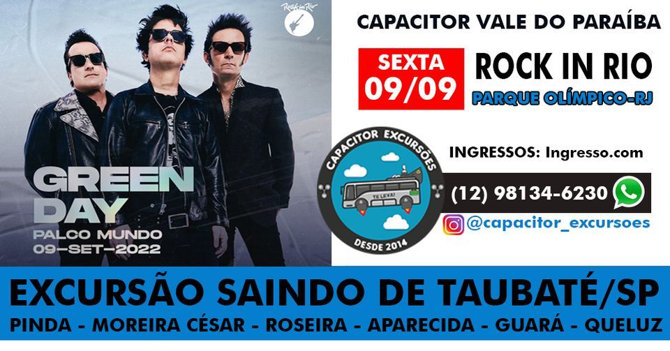 LEIA COM ATENÇÃO:Excursão de Taubaté Capacitor Excursões te leva para: ROCK IN RIO Dia GREEN DAY & AVRIL LAVIGNE ! Sexta-Feira, dia 9 de setembro de 2022.