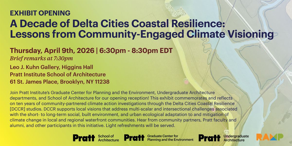Join Pratt Institute’s Graduate Center for Planning and the Environment, Undergraduate Architecture departments, and School of Architecture for our opening reception! This exhibit commemorates and reflects on ten years of community-partnered climate action investigations through the Delta Cities Coastal Resilience [DCCR] studios. DCCR supports local visions that address multi-scalar and intersectional challenges associated with the short- to long-term social, built environment, and urban ecological adaptation to and mitigation of climate change in local and regional waterfront communities. Hear from community partners, Pratt faculty and alumni, and other participants in this initiative. Remarks will begin at 7:30pm. Light refreshments will be served.