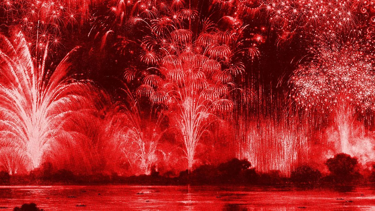 Featured image: Panorama of the National Firework Display at Hyde Park, 19th July, 1919, colorized illustration from Pyrotechnics: The History and Art of Firework Making, 1922.
