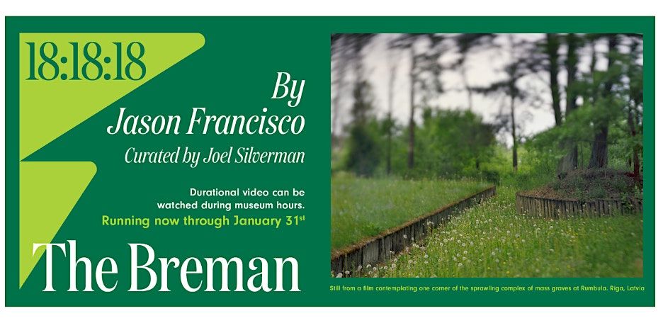 Curated by Joel Silverman, 18:18:18 (2018) by Jason Francisco is a series of eighteen time-based works that exist between cinema and photography, each filmed in a single take at one of roughly 50,000 sites of the Jewish Holocaust. Each piece lasts exactly 18 minutes, 18 seconds, and 18 milliseconds—a duration tied to the Jewish number chai, meaning “life”—and is presented on two opposing screens that cannot be viewed simultaneously, mirroring how Jewish memory in former shtetls across Poland, Romania, Hungary, and Ukraine is often glimpsed only over one’s shoulder.