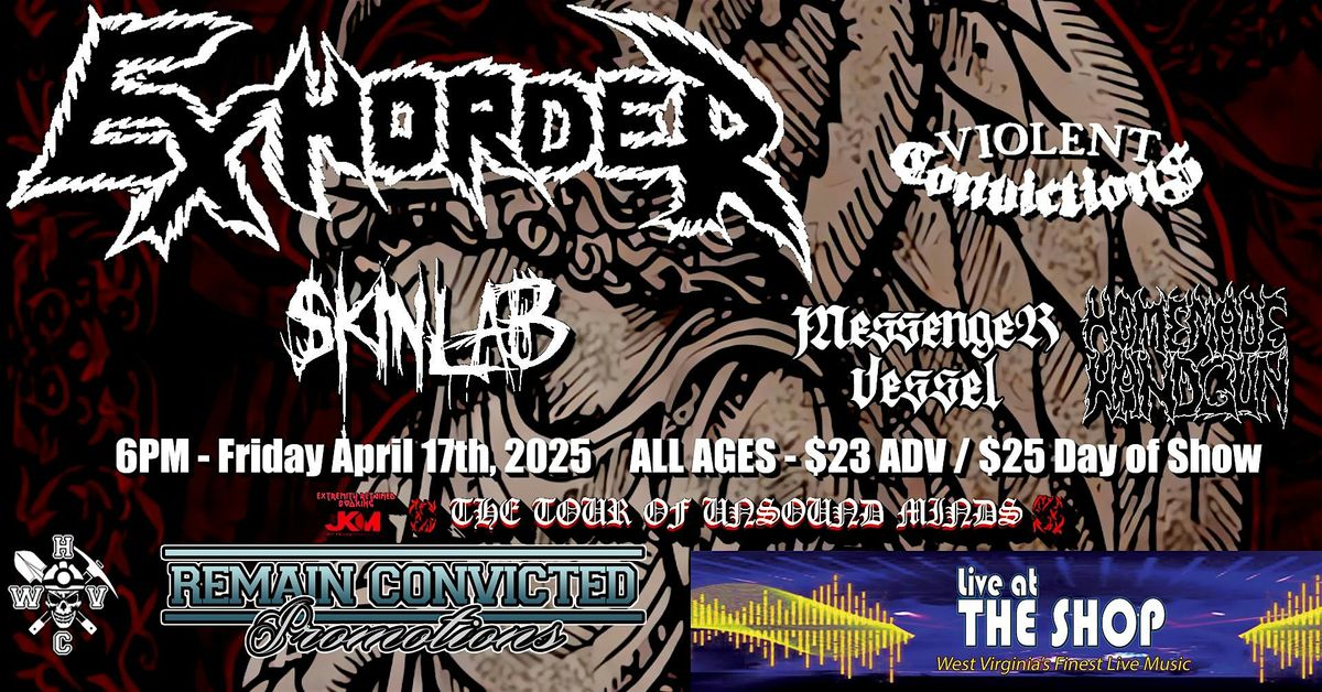 Check out Thrash and Groove Metal pioneers Exhorder from New Orleans with Skinlab from San Fransisco as they play Live at the Shop in Dunbar, West Virginia on the Tour of Unsound Minds. They are joined by Violent Convictions, Messenger Vessel, and Homemade Handgun.