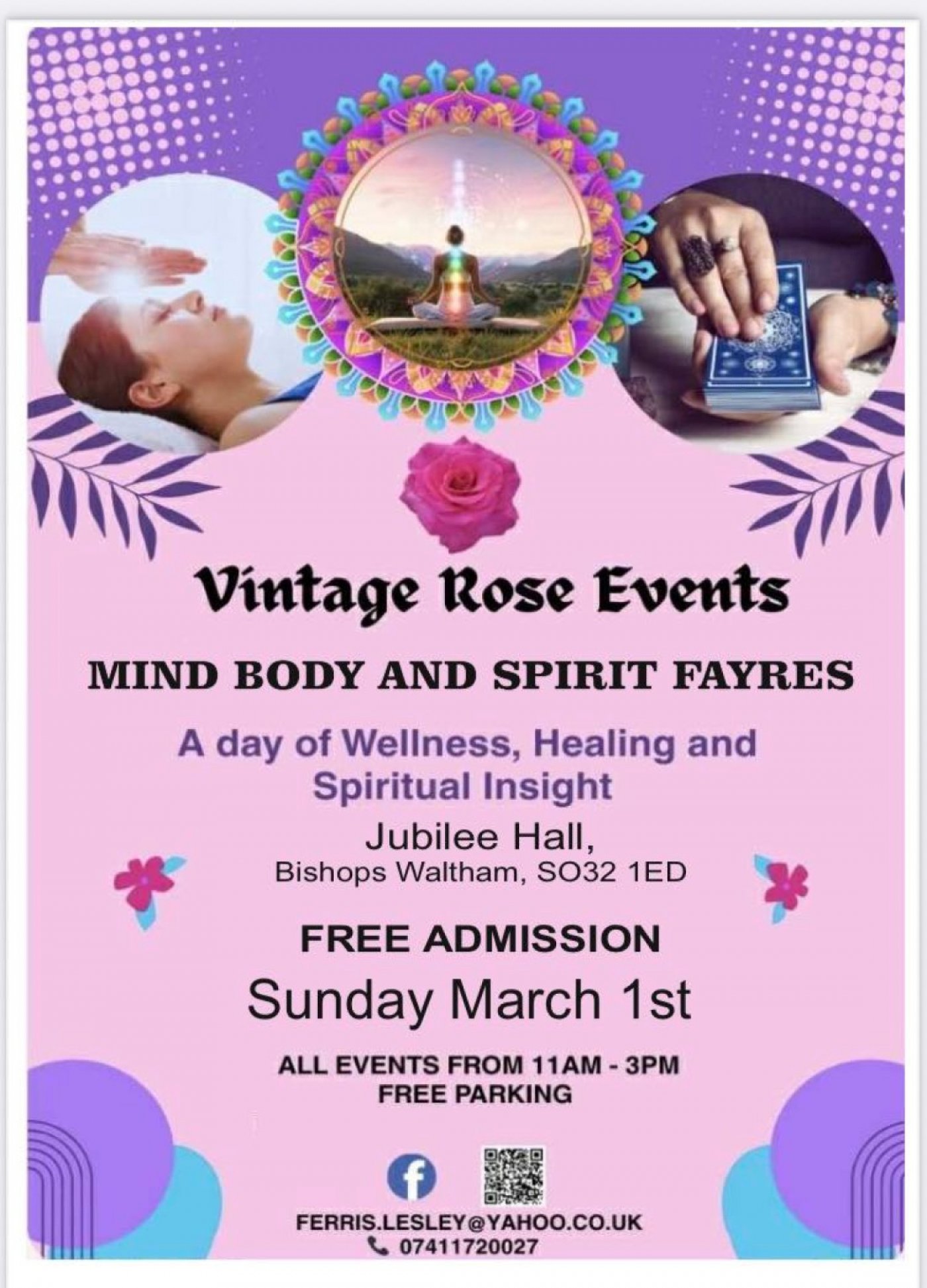 Vintage Rose Events is delighted to announce the return of its popular Mind, Body & Spirit Fayre, taking place on Sunday 1st March 2026 at Jubilee Hall, Bishops Waltham. Running from 11am to 3pm, this uplifting community event brings together holistic practitioners, spiritual readers, artisan makers, and wellness experts from across Hampshire.
