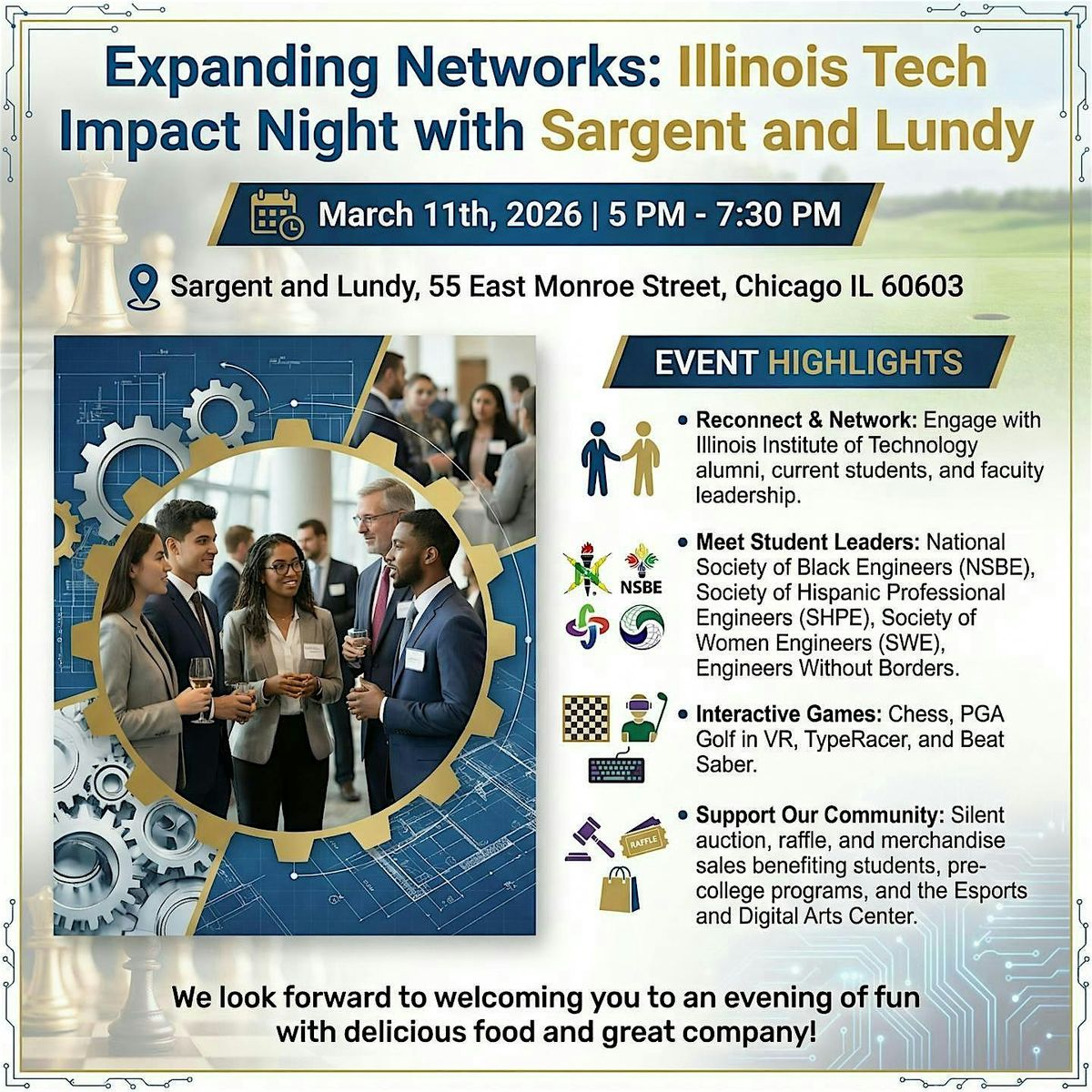 Please join us as we bring Illinois Institute of Technology alumni at Sargent & Lundy together for an engaging evening in a relaxed, welcoming setting. The event will provide meaningful opportunities for alumni to reconnect, network with current students, and hear insights from Illinois Tech faculty leadership. There will be an opportunity to meet student leaders from the National Society of Black Engineers (NSBE), Society of Hispanic Professional Engineers (SHPE), Society of Women (SWE), Engineers without borders and more. We will have opportunities to connect through games such as Chess, PGA Golf in VR, and Beat Saber. In addition, attendees will have the opportunity to support our students, pre-college programs, and the Esports and Digital Arts Center through a silent auction, raffle, and merchandise sales.
