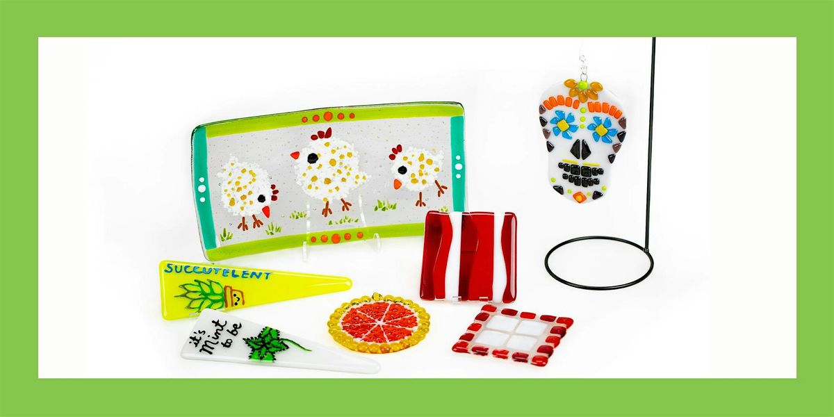 In this 3-hour kiln forming glass workshop, each participant will demonstrate the basic techniques of kiln formed glass to make at least two individual items. You will work with our instructors to cut and layer sheet glass with glass frit and stringers to create a design for a unique 12"x6" dish or platter and a seasonal item. Items created will be ready for pick up five business days after made.