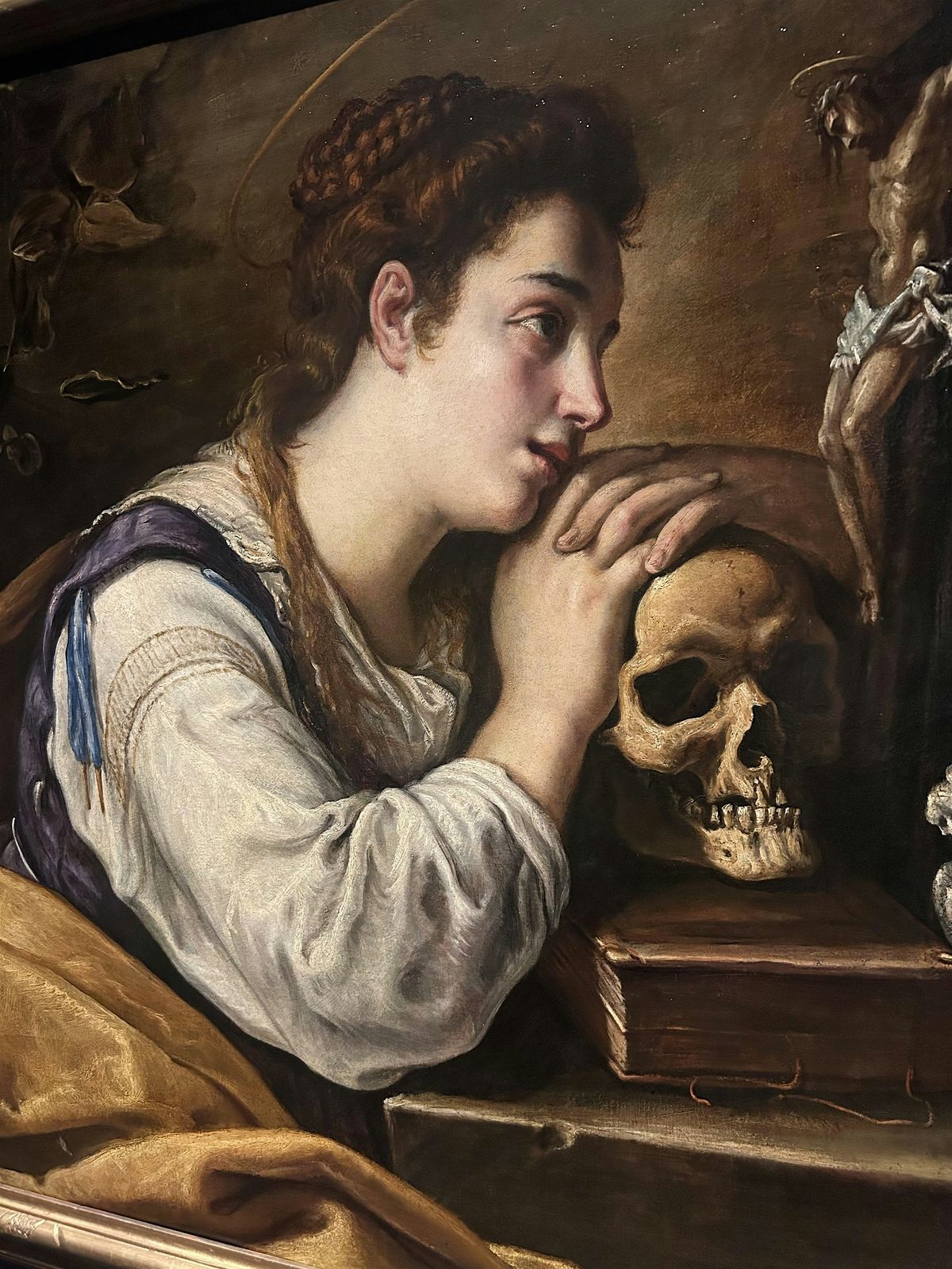 Caravaggio (1571-1610) transformed art history with his dramatic use of light and shadow — known as chiaroscuro — and his intense realism, which came from direct observation rather than the idealized modeling favored by earlier artists. His work brought a striking naturalism and emotional depth to religious subjects and everyday life. Caravaggio’s innovations inspired a whole generation of painters called the Caravaggisti, several of whom are featured in the exhibition.