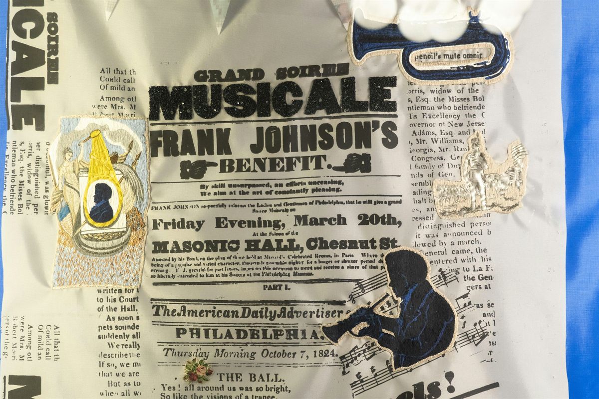 Textile artist Santé Johnson created The Arrival: Soirée Musicale as part of a city-wide project Radical Americana organized by The Clay Studio. The work explores the life and music of musician, composer, and international band leader Francis Johnson, a member of Philadelphia’s 19th century Black community. Informed by archival research at both HSP and Winterthur Museum, Garden, and Library, The Arrival: Soirée Musicale both depicts moments in the musician’s extraordinary career and draws attention to the vital contributions of the trades class of textile and embroidery workers.