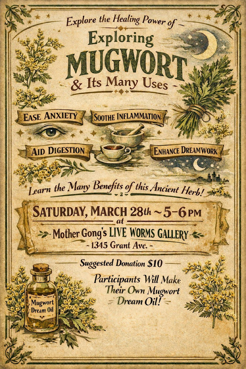 Join us for a fun, in-person gathering where we'll dive into the world of mugwort! Discover its cool uses, from herbal remedies to dream enhancement. Come learn, share, and connect with others interested in focusing on this underrated magical plant. Participants will make their own mugwort dream oil to take home.