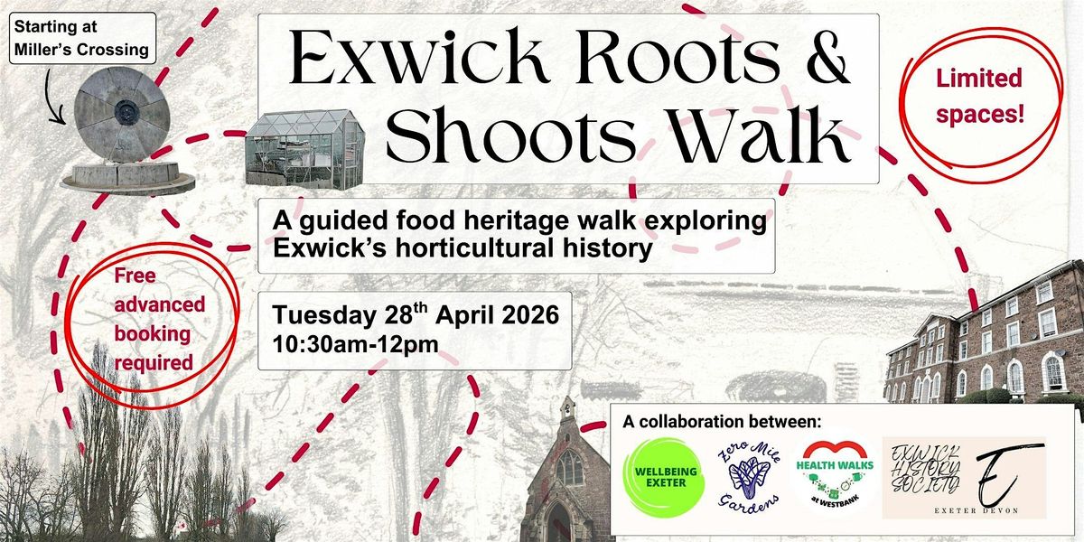 Join us on Tuesday 28th April 2026 for the Exwick Roots & Shoots walk. This will be a gentle guided walk where you will hear stories and curious facts about Exwick's old plant nurseries and market gardens, including exotic plants - melons and magnolias, plant theft - crime & punishment, and allotments and orchards - linking past and present growing activities.
