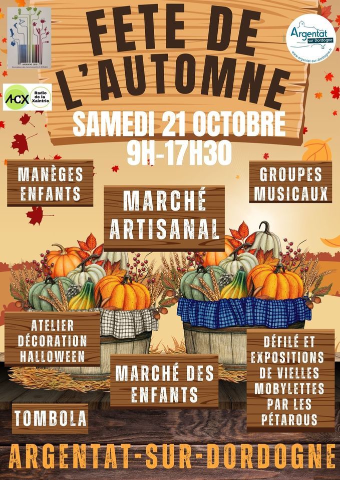 2ème fête de l'automne de l'association des commerçants d'Argentat-sur-Dordogne.Manèges, ateliers, Marché des enfants, groupes musicaux, défilé et exposition de vielles mobylettes par les pétarous