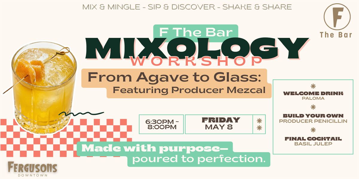 Join us at F the Bar for From Agave to Glass, our May Mixology Workshop featuring Producer Mezcal—a hands-on night built around fresh ingredients, bright citrus, and cocktails with a subtle smoky edge. Whether you’re coming with friends, planning a date night, or flying solo, this workshop is all about good company and great pours.