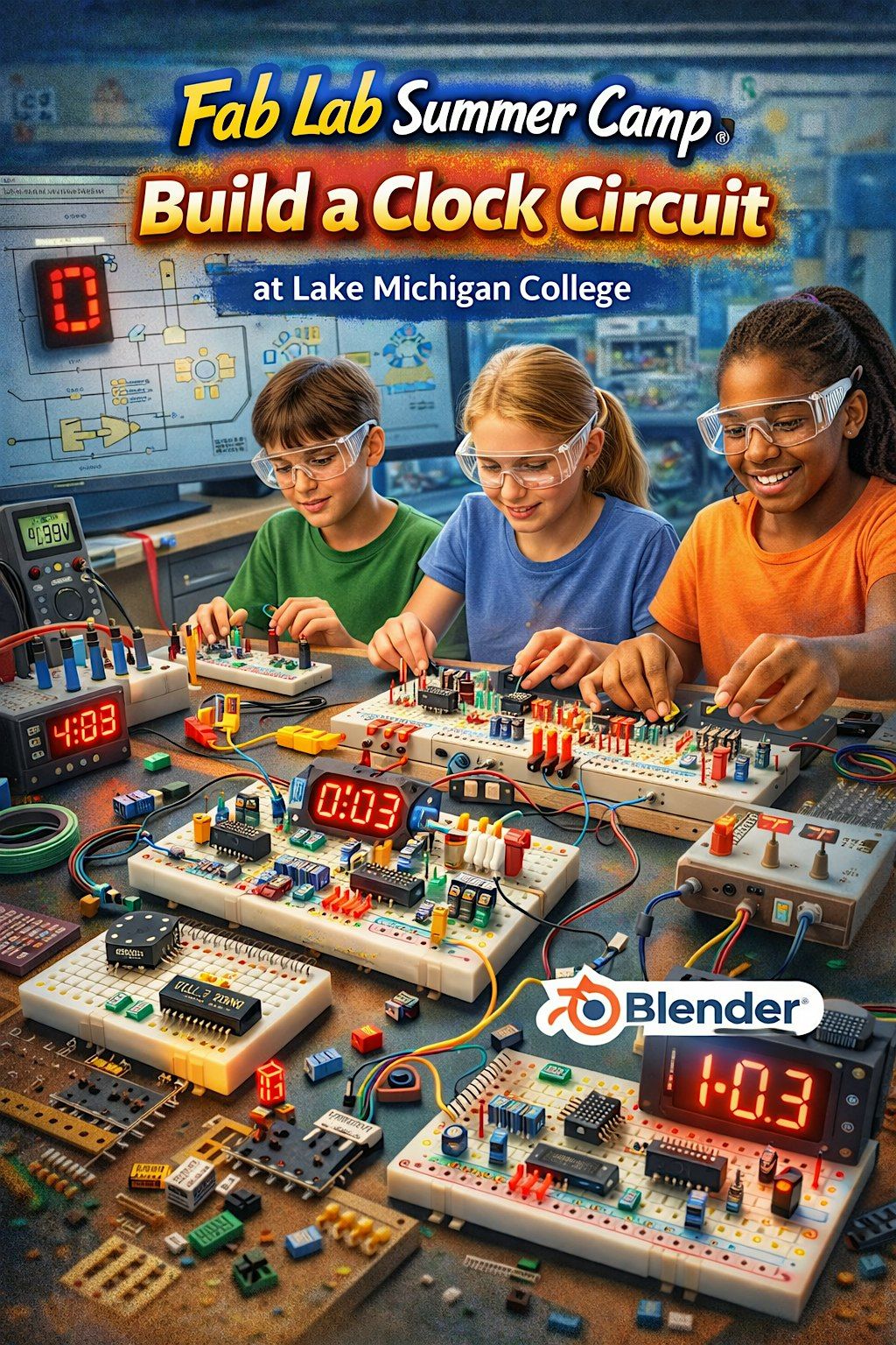 Curious how electronics really work? In this beginner-friendly Fab Lab summer camp, students will dive into the fundamentals of digital electronics by building a working clock circuit from the ground up—no soldering required!