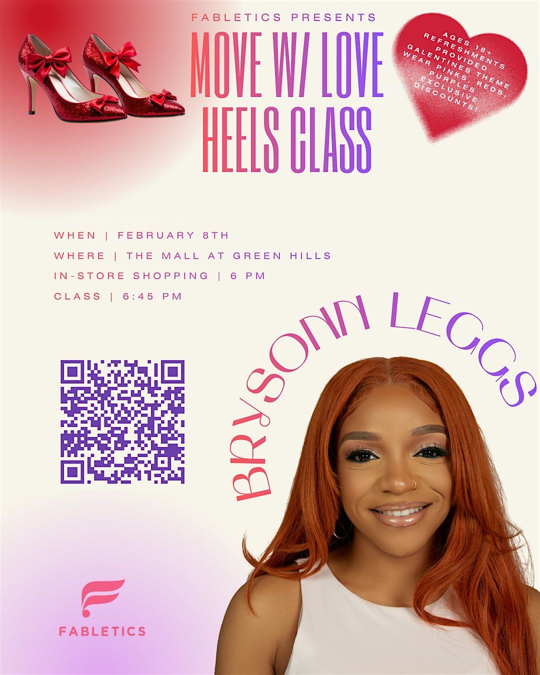 An adult-only heels dance class focused on confidence, sensual movement, and self-expression, led by Brysonn Leggs. This experience will be privately hosted within the Fabletics store and curated for a more intimate, elevated Galentine’s celebration.
