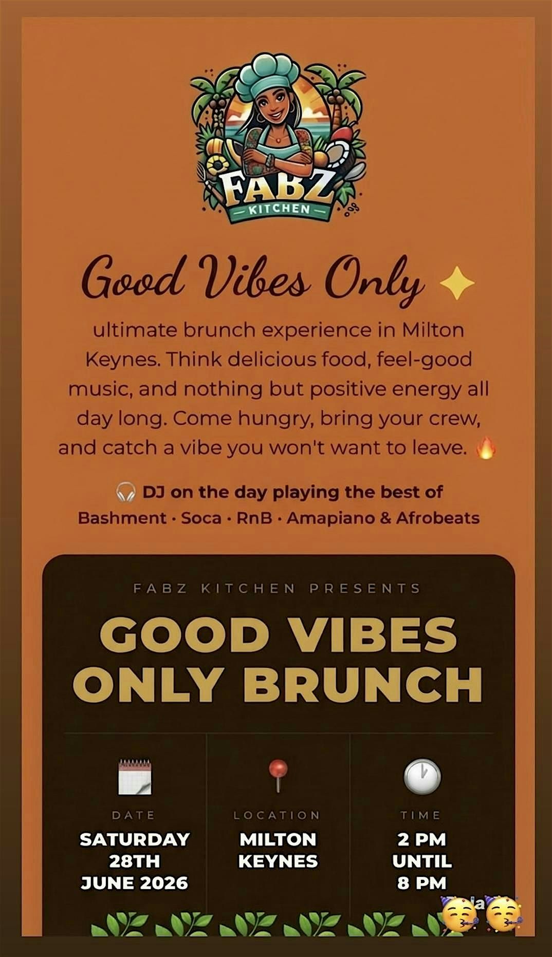 Hey foodies! Join Fabz Kitchen at the Good Vibes Only Brunch for great food, great music, and a vibrant atmosphere you won’t want to miss