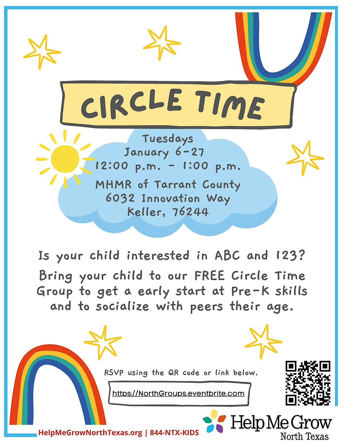 Bring your child to our FREE Circle Time Group to get a early start at pre-k skills and to socialize with peers their age. This group helps to prepare children for pre-kindergarten. Children will practice being able to sit and attend to structured activities. Throughout the group, children will work on cognitive skills, gross motor, fine motor, and language skills to help further their development. This group will focus on colors, numbers, letters, shapes, weather and a variety of other pre-k skills.