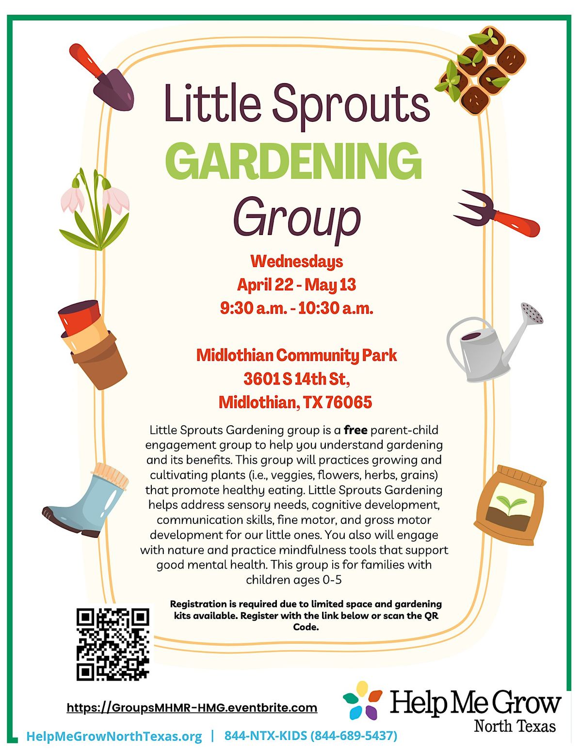 El grupo de Jardinería Little Sprouts es gratis para padres e hijos y se enfoca en comprender la jardinería y sus beneficios. Este grupo practicará el cultivo de plantas (verduras, flores, hierbas y granos) para promover una alimentación saludable. En el grupo de Jardinería Little Sprouts nuestros pequeños practicaran las habilidades sensoriales, cognitivas, comunicativas y la motricidad fina y gruesa. Las familias también se conectarán con la naturaleza y practicarán habilidades de atención plena para una buena salud mental.