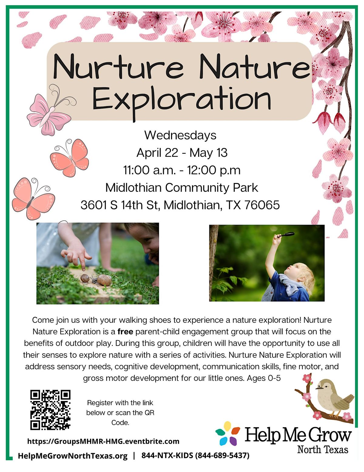 Come join us with your walking shoes to experience a nature exploration! Nurture Nature Exploration is FREE a parent-child engagement group that will focus on the benefits of outdoor play. During this group, children will have the opportunity to use all their senses to explore nature with a series of activities. Nurture Nature Exploration will address sensory needs, cognitive development, communication skills, fine motor, and gross motor development for our little ones, ages 0-5. It's encouraged to sign up for the whole series!