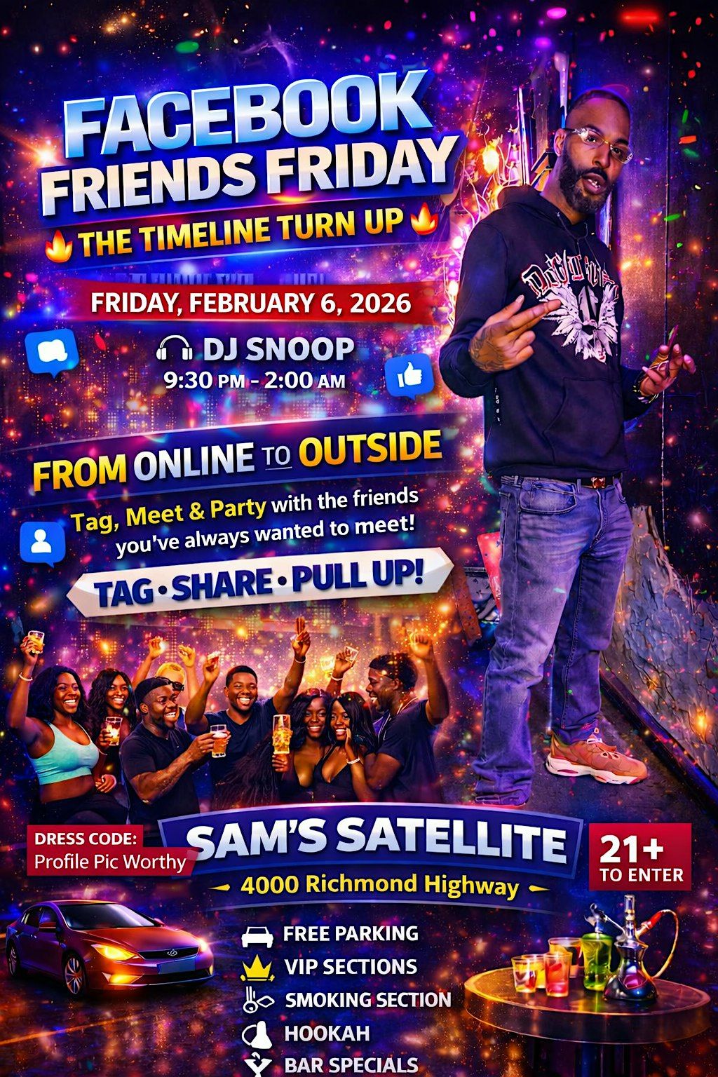 Share& tag those online friends you always wanted to meet!!!;9:30pm til 2am Music By DJ Snoop