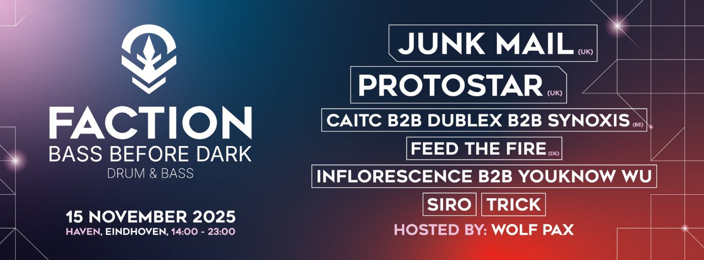 For the first time Faction takes over the daytime. From 14:00 to 23:00 at Haven Eindhoven expect a full-on drum & bass takeover with international Dutch and local talent delivering explosive sets and nonstop energy.Lineup: