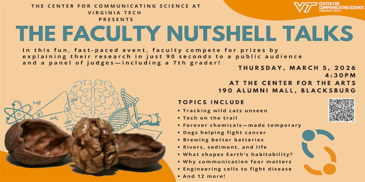 Curious about the research happening at Virginia Tech and how it connects to our world? Join us for an energetic evening where faculty share their research in just 90 seconds—no slides, no jargon, just engaging stories designed for everyone.From health and environment to technology and society, these bite-sized talks make big ideas accessible and fun. Presenters are judged by a lively panel of community members, campus leaders, and two local seventh graders...because great research should spark curiosity across generations.Come be part of a celebration of learning, storytelling, and discovery. Whether you love science, enjoy learning something new, or just want a fun and inspiring night out, this event is for you. Hosted by the Center for Communicating Science at Virginia Tech