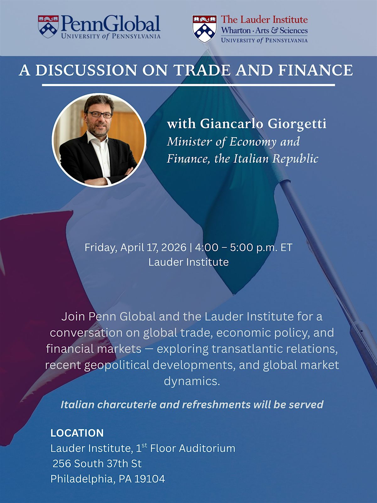 Penn Global and the Lauder Institute warmly invites all Penn faculty to a private roundtable conversation with Giancarlo Giorgetti, Minister of Economy and Finance of the Italian Republic, for a conversation on global trade, economic policy, and financial markets -- exploring transatlantic relations, recent geopolitical developments, and global market dynamics.
