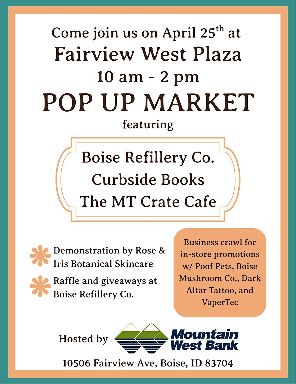 Come check out the Fairview West Plaza Pop Up Market happening on April 25, 2026 at 10:00 AM (MDT)! It’s all going down at 10530 Fairview Ave. Swing by to explore cool local vendors, grab some unique finds, and enjoy a chill atmosphere. Perfect way to spend your Saturday morning with friends and family. Don’t miss out on this fun, in-person event!