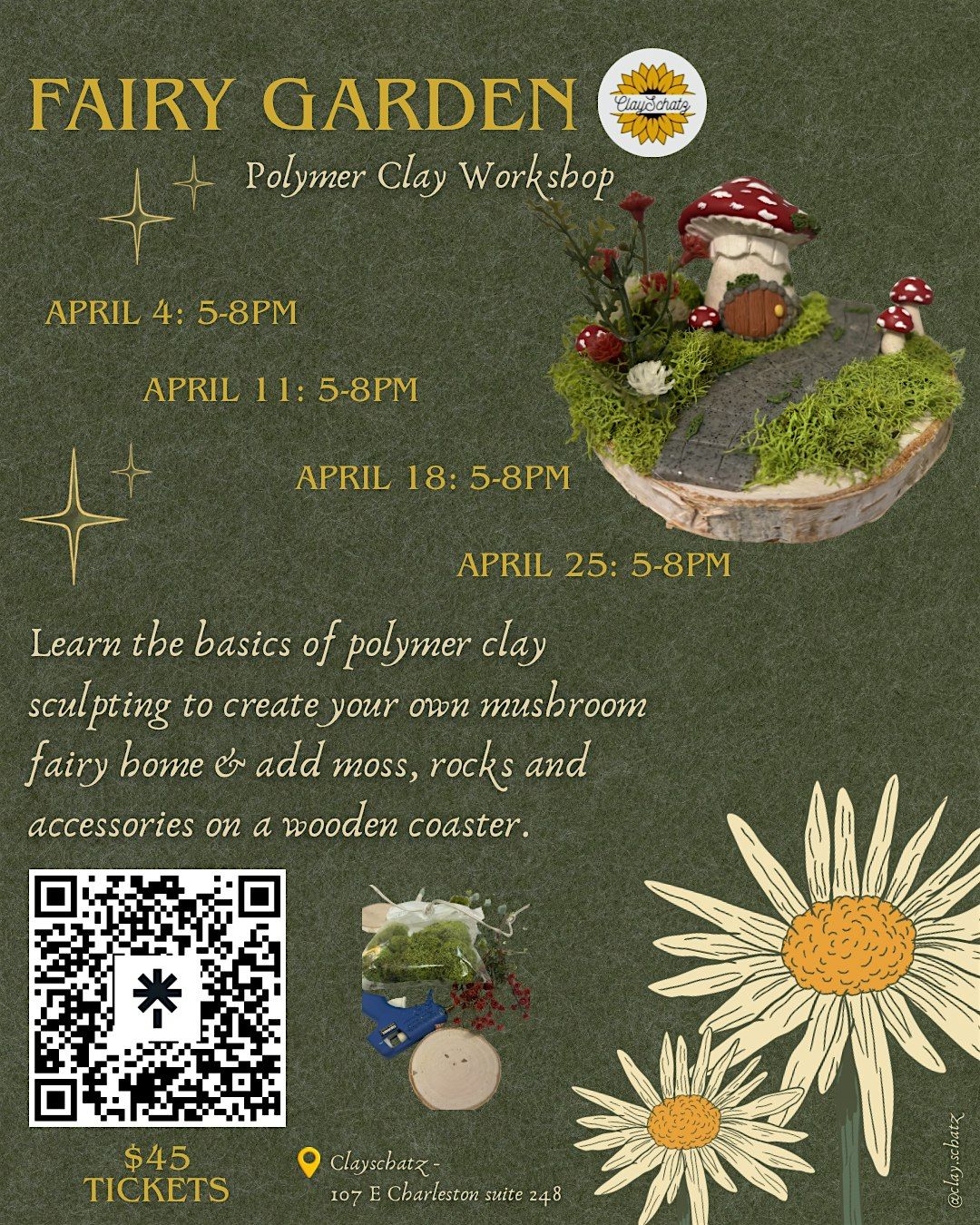 Use my pre made fairy homes and mini mushrooms or create your own Using polymer clay. Add moss, rocks, and flowers to complete your garden! *workshop is for mushroom home and mini mushrooms* - additional pre made miniatures are available for purchase. All materials and instruction included to complete your garden.