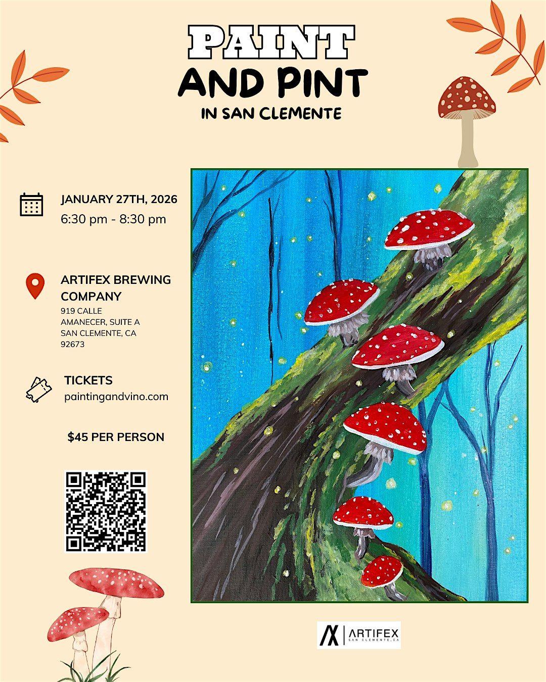 Looking for a creative night out in San Clemente? At this Fairy Mushrooms Paint and sip night, you’ll enjoy a fun evening of creativity and relaxation at the venue, Artifex Brewing Company and instructed by artist, Morgan Palla. The perfect mushroom themed paint night in San Clemente!