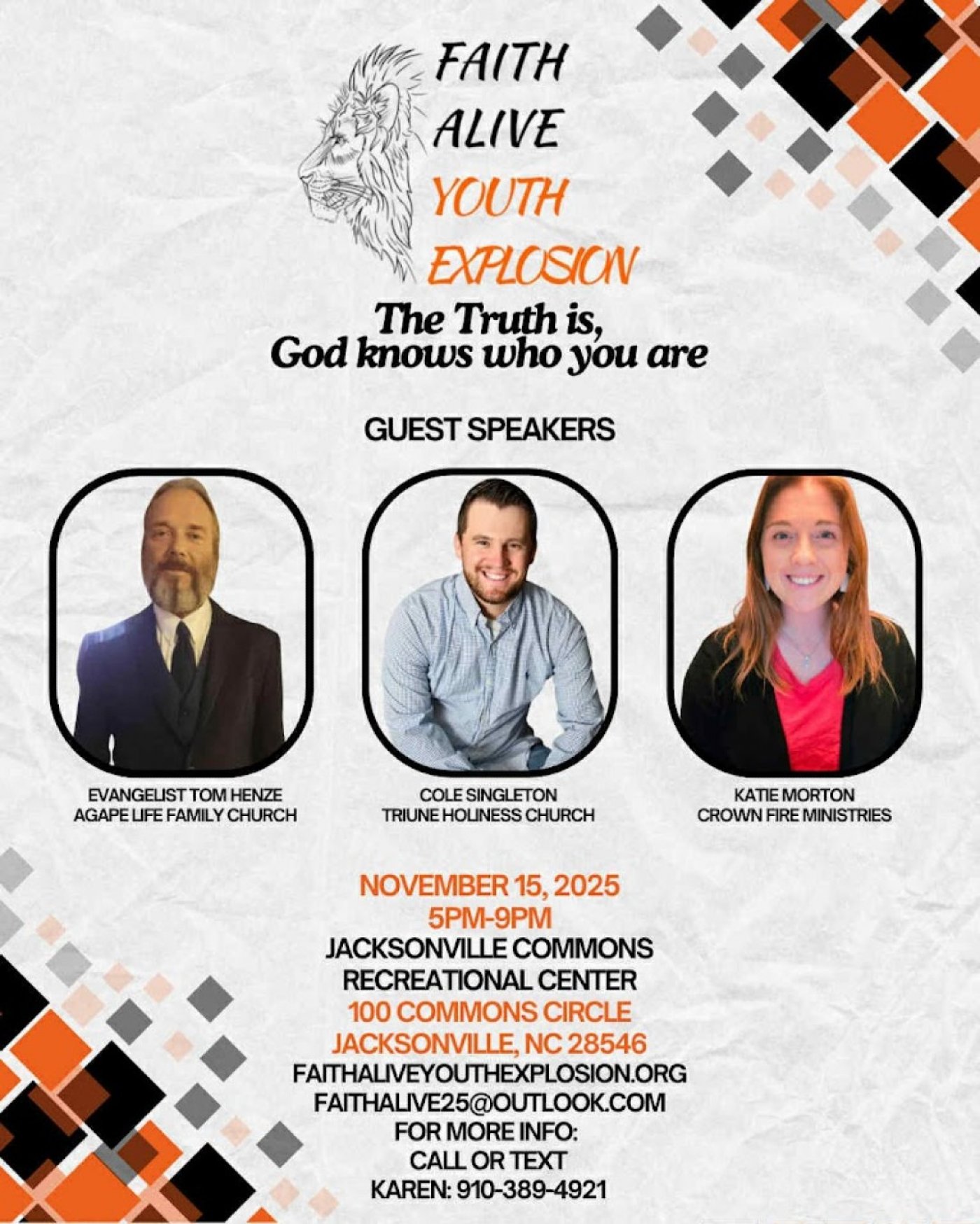 Faith Alive Youth Explosion! Reaching our youth for Jesus! Focusing on ages 12-25 But absolutely everyone is welcome! This is our first annual FREE event. A love offering will be taken for our special guest speakers. No tickets or registration needed. Just come on out.