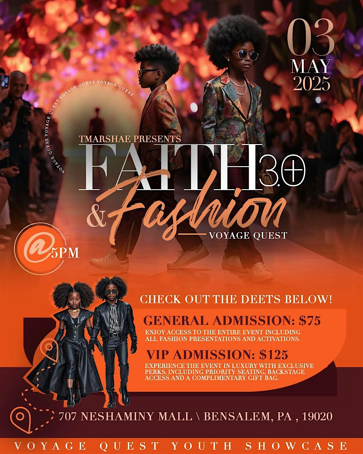 Come join us for an exciting adventure at Faith and Fashion 3.0 Voyage Quest! Get ready to embark on a journey where faith meets fashion in the most stylish way possible. This in-person event will feature runway shows, and inspiring talks from industry experts. Whether you're a fashion enthusiast or simply looking for some style inspiration, this event is perfect for anyone who wants to explore the intersection of faith and fashion. Don't miss out on this unique experience!