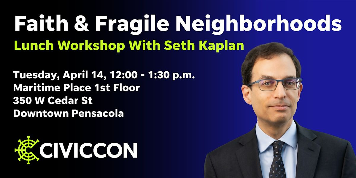 Seth Kaplan will also be delivering a free public CivicCon presentation in Pensacola on Tuesday, April 14 (Register for that here). This luncheon offers a more focused setting for faith leaders to engage directly with the ideas from Fragile Neighborhoods and apply them to their work.