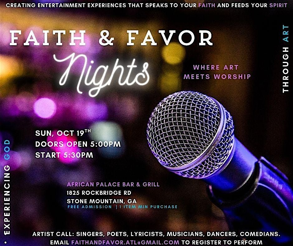 Join us for another Faith & Favor Nights at African Palace Bar And Grill for an evening filled with Faith, Food & Entertainment. This in-person event is where art meets worship, so come ready for fellowship, great artists, and a good time that will speak to your faith and feed your spirit.