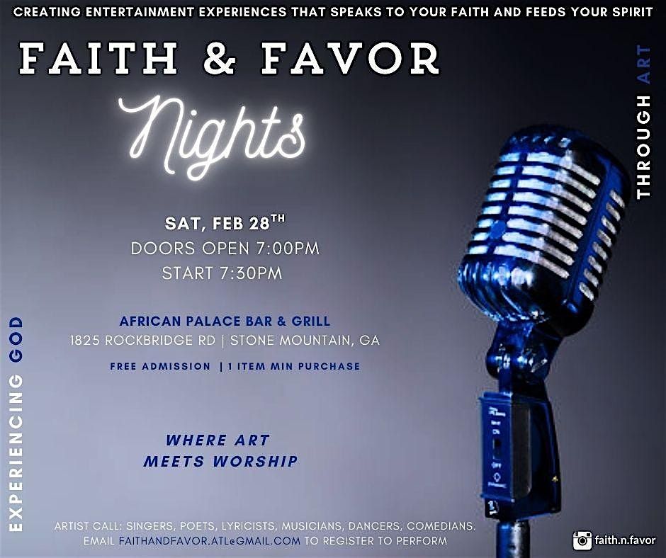 Join us for another Faith & Favor Nights at African Palace Bar And Grill for an evening filled with Faith, Food & Entertainment. This in-person event is where art meets worship, so come ready for fellowship, great artists, and a good time that will speak to your faith and feed your spirit.
