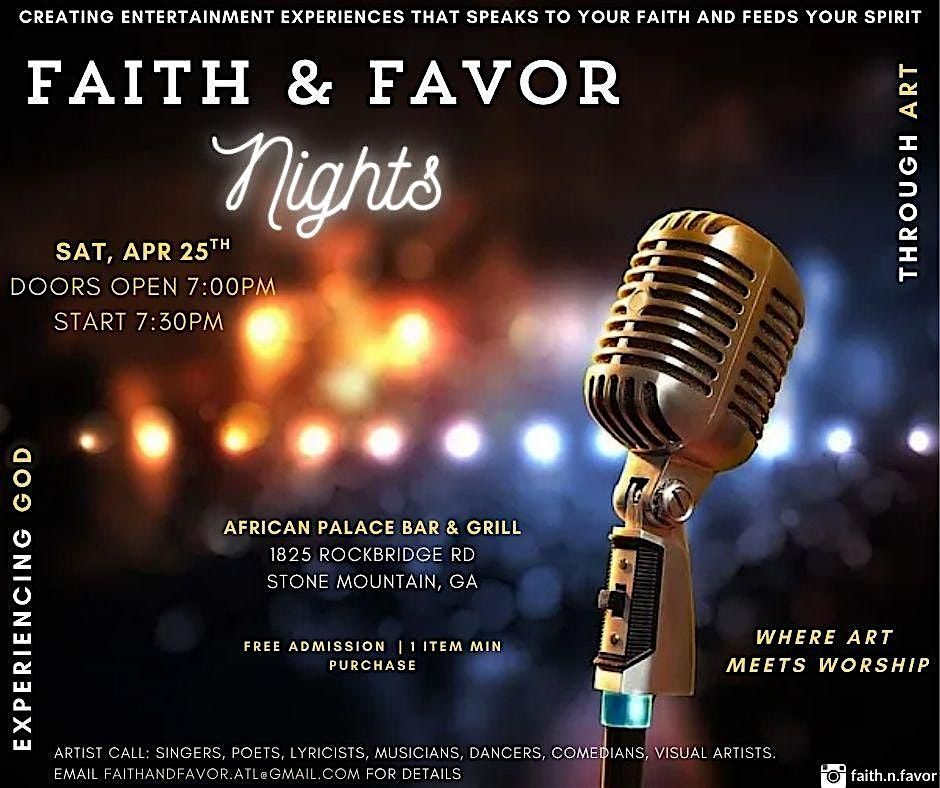 Join us for another Faith & Favor Nights at African Palace Bar And Grill for an evening filled with Faith, Food & Fellowship. This in-person event is where art meets worship, so come ready for a good time that will speak to your faith and feed your spirit.