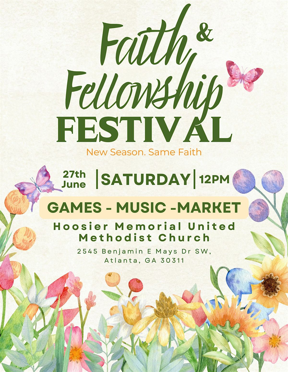 The Faith & Fellowship Festival is a free, full-day community experience hosted by Intentionally Becoming in partnership with Hoosier Memorial United Methodist Church. Taking place on Saturday, June 27, 2026 from 12PM to 5PM in Atlanta, Georgia, this event brings together families, women, and community members of all backgrounds for a day of faith, connection, and celebration.