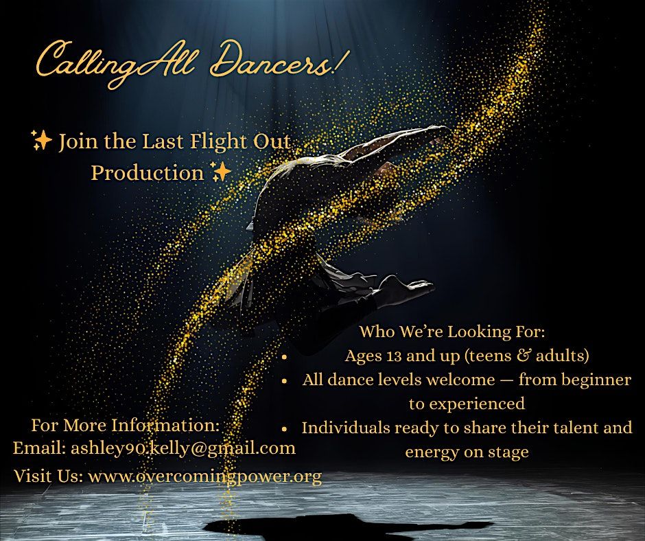Ready to express yourself and have a blast? Join our Faith Dance Class Workshop where we mix moves with meaning! This is the perfect chance to dive into dance and even get involved in a cool Play Production ( The Last Flight Out)—all in person. Come meet new friends, learn some awesome choreography, and enjoy a creative space that lifts your spirit. Don’t miss out on the fun and faith-filled energy!