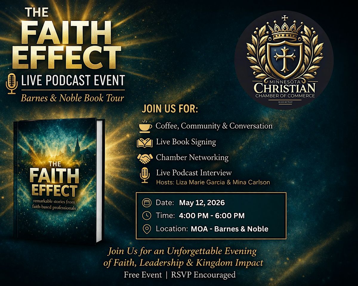 Join us for The Faith Effect – Live Podcast Event at Barnes & Noble (MOA), an inspiring evening created to connect faith-driven professionals and introduce the impact of the Minnesota Christian Chamber of Commerce.