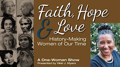 Vikki J. Myers, co-founder and director of worship of Kingdom Impact Theater Ministries, will present a revival of her monologue and music performance, "Faith, Hope and Love: History-Making Women of Our Time," on Saturday, March 28, at the St. Charles Library. Show time is 1 PM in the Carnegie Room.