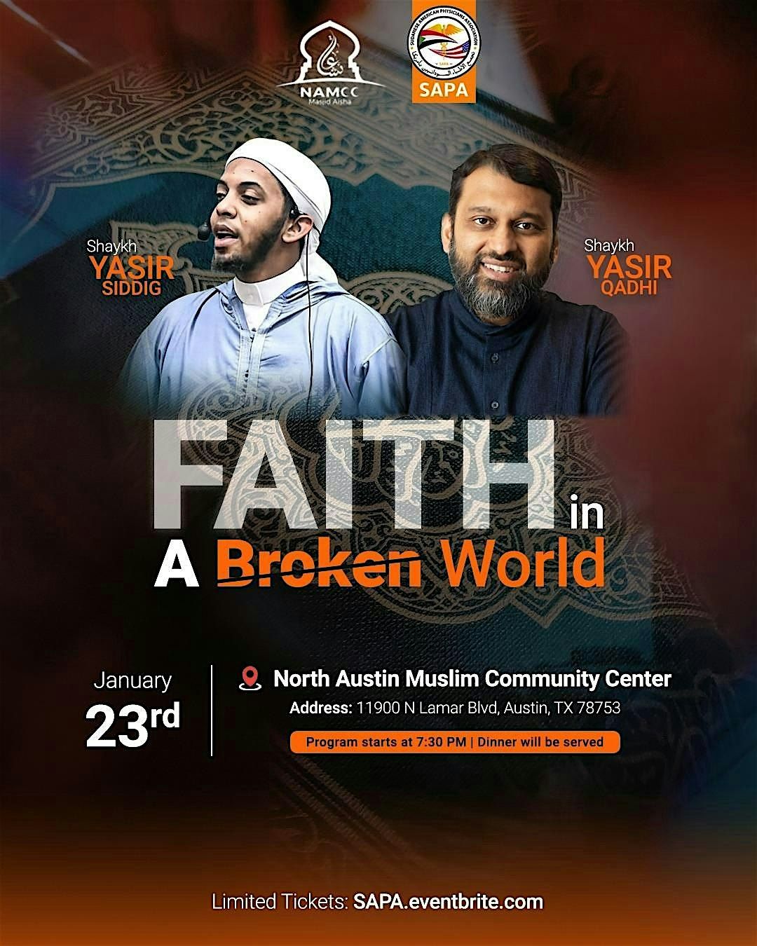 Join us in person for an inspiring gathering where we explore how to keep faith alive amidst life's challenges. This event is all about finding hope and strength even when things feel tough. Come connect, share stories, and discover ways to stay grounded in your beliefs. Let’s navigate this broken world together, with Shaykh Yasir Qadhi and Shaykh Yasir Siddig
