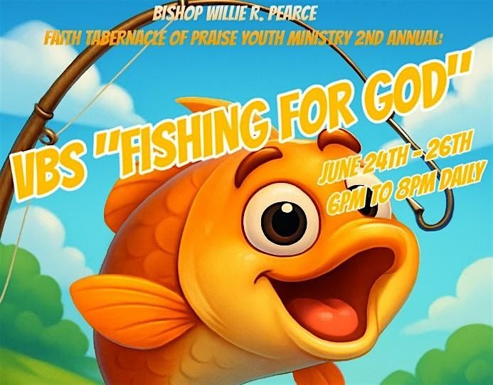 Welcome to the Faith Tabernacle Of Praise Ministry 2nd Annual: VBS "Fishing For God" event! Join us at 1330 Tucker St starting June 24, 2026 at 6:00 PM (Eastern Time) for a fun-filled evening. Let's dive into exciting activities, games, and lessons that will surely make a splash in your child's summer. Don't miss out on this opportunity to reel in some faith and have a whale of a time! See you there!