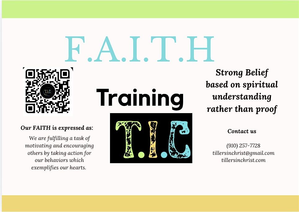 F.A.I.T.H Training is a 5-week committment to bettering ourselves in 5 areas. 1) Spritiual Fitness, 2) Acquiring, 3) Inspiration, 4) Spiritual Training, and 5) Focusing on the 7 hearts of the Bible. Purchase the Book to be prepared for to begin the training: https://a.co/d/05Fi2kWC The journey is beautiful, completed as a group, engaging, enlightening, and inspirational for all who are in attendance. This journey is for those who are ready to stretch and step into things they have been called to do, but are hesitant to get started.