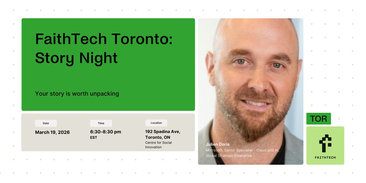 Join us in person for an inspiring evening at FaithTech Toronto Story Night featuring Julien Doria from Microsoft. Julien will share personal stories about his faith, technology, and his time working at Microsoft as a senior specialist. Don't miss this chance to hear from Julien and get together with like-minded folks. See you there!