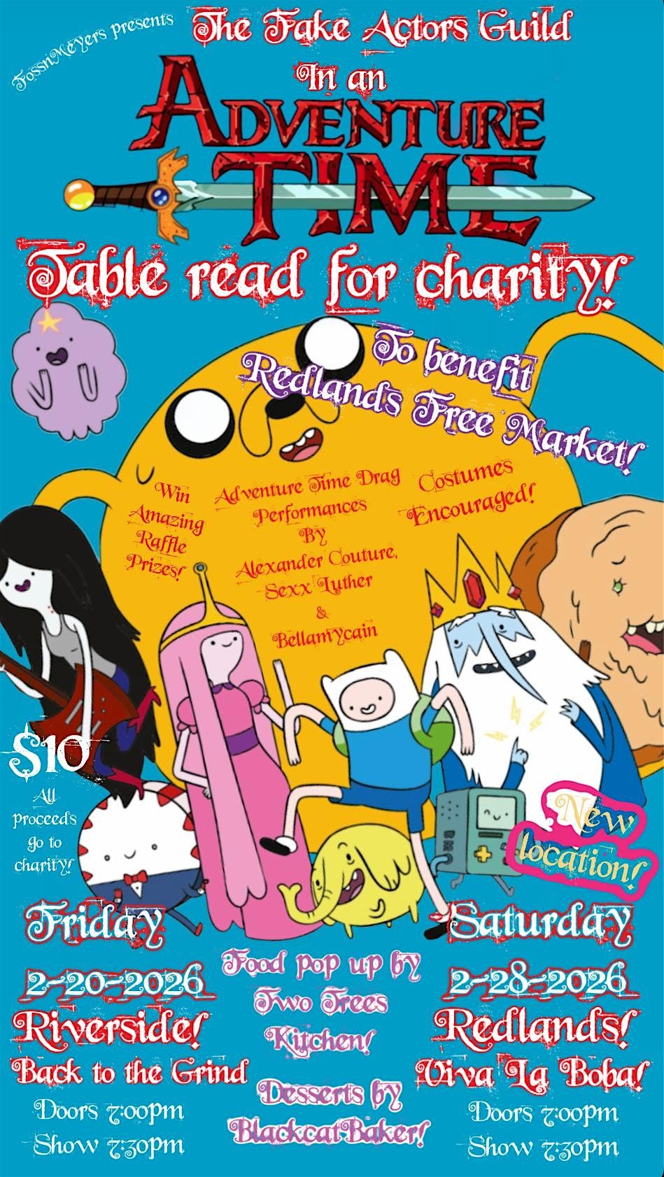 The Fake Actors Guild returns for their first show of the year! To kick it off right we are doing a reading of TWO Adventure Time scripts live in front of and audience. One script the actors are aware of and the second script is a secret. Even they don't know what their second script will be! The show will have props, sound effects, audience participation and a bunch of silly volunteers committed to giving a great performance! All for a great cause!