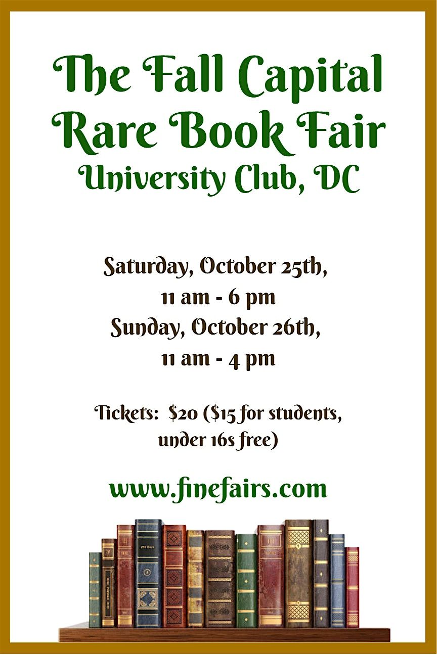 The Fall Capital Rare Book Fair will bring a dozen rare book dealers to the University Club. It will take place in conjunction with a rare book collecting festival, featuring panels, talks, site visits and social events.