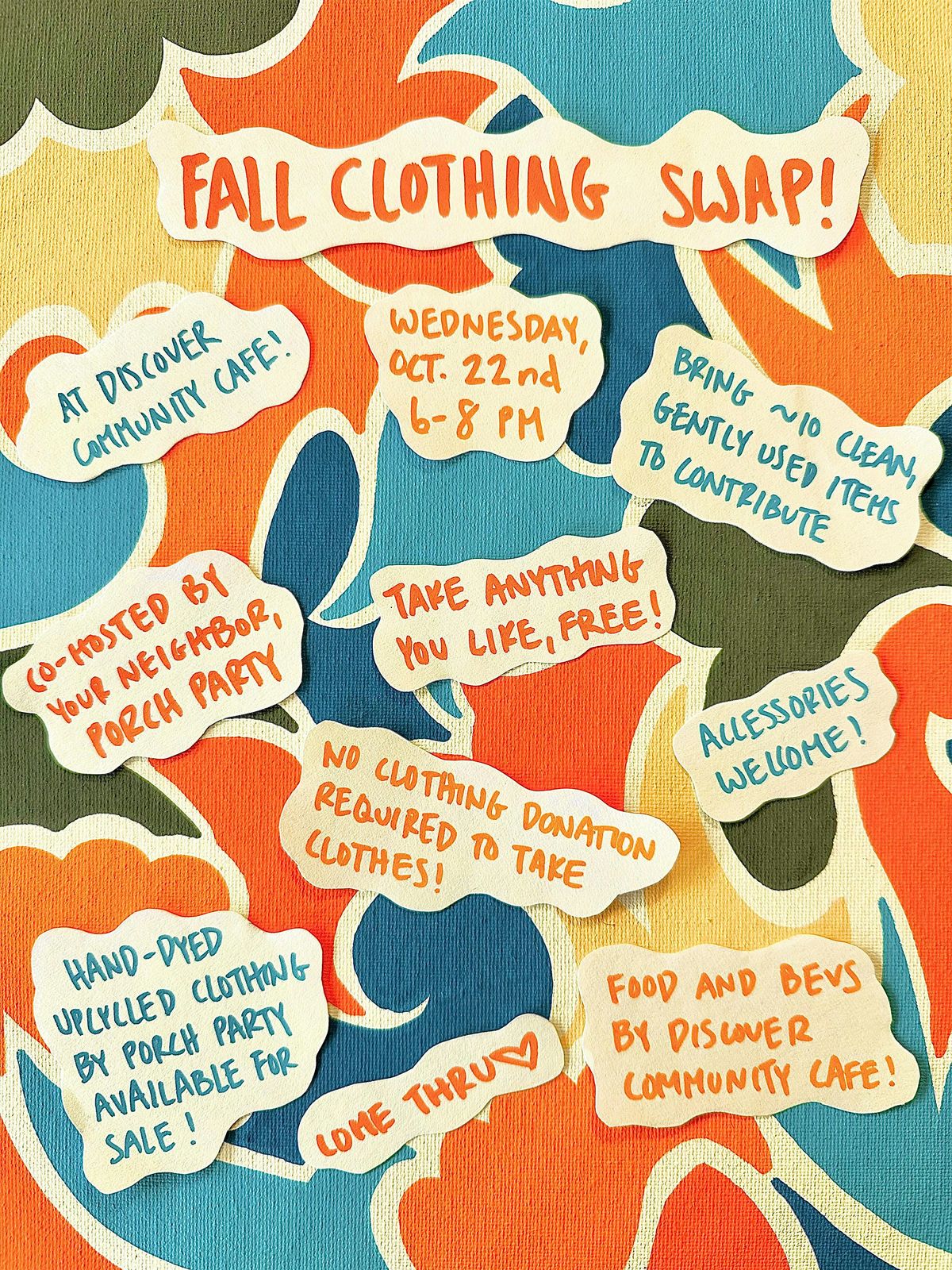 Join Porch Party and Discover Community Cafe for our upcoming Clothing Swap—an eco-friendly event where you can bring gently used clothes and trade them for something new-to-you. While you browse, enjoy fun drinks, tasty snacks, and a welcoming atmosphere. It’s a great way to connect with neighbors, reduce textile waste, and have a little fun.