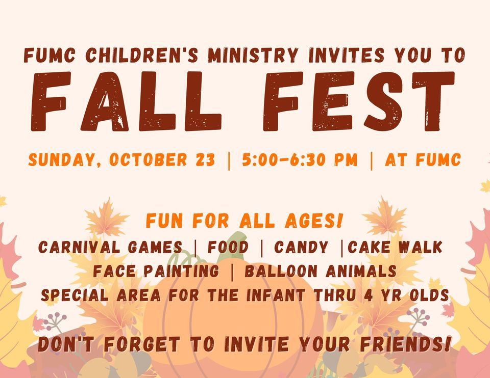 Fall Fest 2022 will be from 5 pm-6:30 pm at First United Methodist Church!There will be carnival games, photo booths, hamburgers + hot dogs, and so much more! There will also be a special area just for our youngest friends (4 years old and younger).