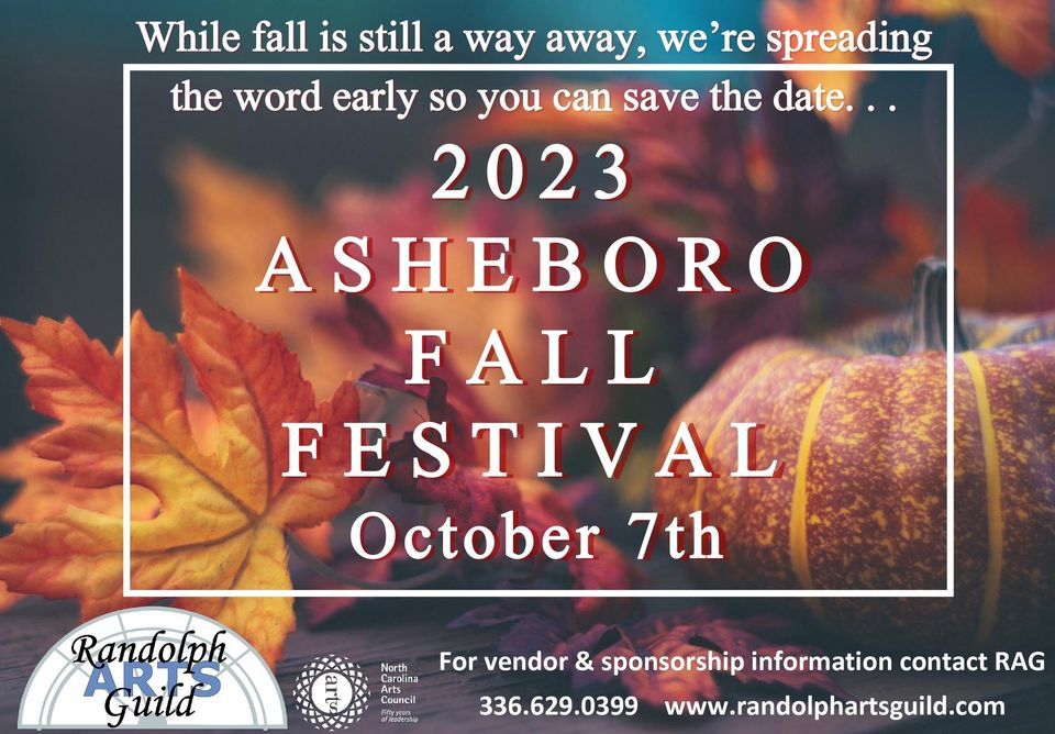 48th Annual Fall Festival Returns to Downtown Asheboro in 2023You spoke and we listened! While the Fall Festival has historically been held over two days, this year, based on the responses and feedback of vendors, attendees and community members, the Fall Festival will be a one day event. The Randolph Arts Guild Board of Directors is excited to announce the 48th Annual Fall Festival to be held the first Saturday in October 2023. The Guild and Historic Downtown Asheboro will welcome vendors, artists, musicians, artisans, and festival goers on Saturday, October 7th from 9am - 6pm.