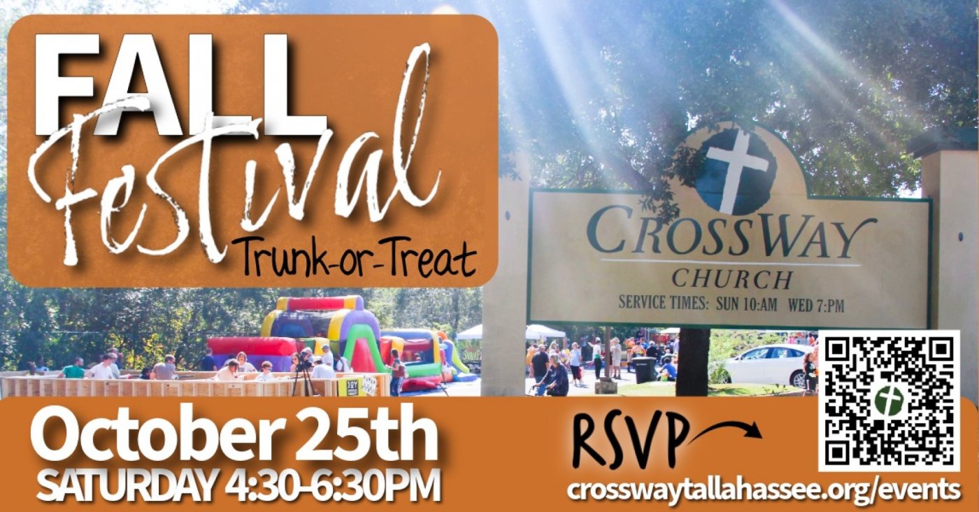 Join Crossway Church for a free Fall Festival and Trunk or Treat on Saturday October 25 from 4:30–6:30 p.m. at 1698 Village Square Blvd. Enjoy family fun with a dunk tank face painting bounce houses human foosball games and more. Families are encouraged to wear their favorite costumes and bring a bag for candy!